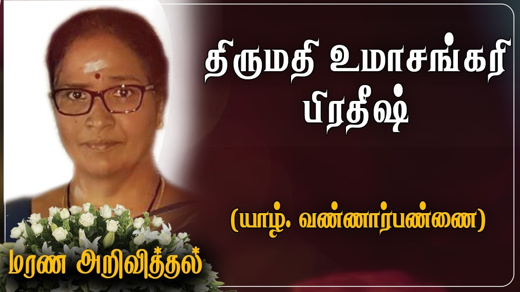 யாழ். வண்ணார்பண்ணையைப் பிறப்பிடமாகவும், இணுவில் துரைவீதியை வதிவிடமாகவும் கொண்ட உமாசங்கரி பிரதீஷ் அவர்கள் 30-06-2021 புதன்கிழமை அன்று இறைவனடி சேர்ந்தார்.