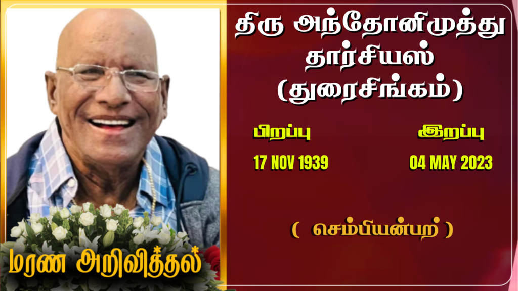யாழ். செம்பியன்பற்றைப் பிறப்பிடமாகவும், கனடா Brampton ஐ வசிப்பிடமாகவும் கொண்ட அந்தோனிமுத்து தார்சியஸ் அவர்கள் 01-05-2023 திங்கட்கிழமை அன்று இறைபாதம் அடைந்தார்.