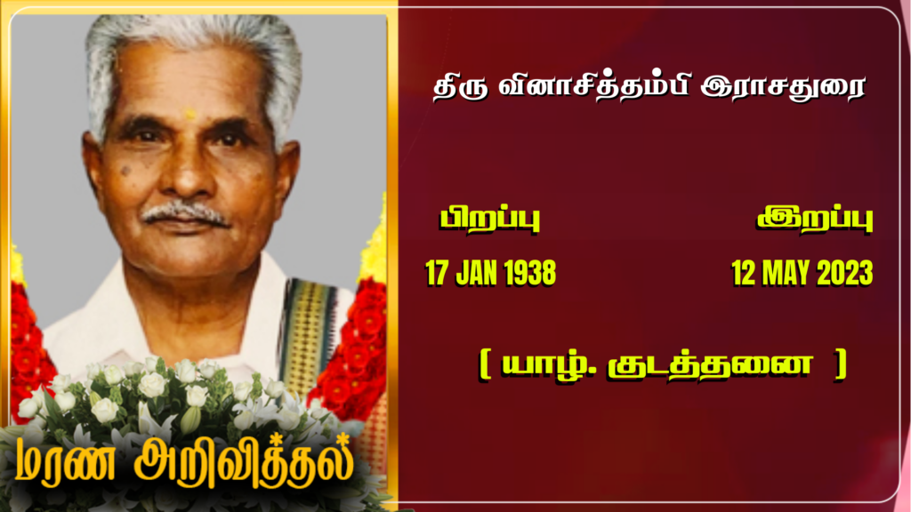 யாழ். குடத்தனை கிழக்கைப் பிறப்பிடமாகவும், வசிப்பிடமாகவும் கொண்ட வினாசித்தம்பி இராசதுரை அவர்கள் 12-05-2023 வெள்ளிக்கிழமை அன்று காலமானார்.