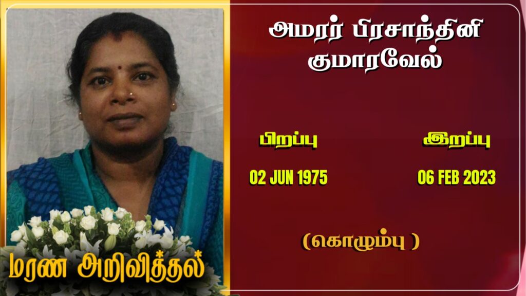 கொழும்பு -02, சேர்ச் வீதியை பிறப்பிடமாகவும் கொழும்பு -10, மாளிகாவத்தையை வசிப்பிடமாகவும் கொண்ட திருமதி பிரஷாந்திணி குமாரவேல் (சர்வதேச பாடசாலை ஆசிரியை) 06.02.2023 திங்கட்கிழமை இறைபதம் அடைந்தார்.அன்னார் கா.குமாரவேல் (செல்வம்) அவர்களின் அன்புப் பாரியாரும் கு. மிரிதுளாவின் பாசமிகு அன்னையுமாவர். கொம்பனி வீதியைச் சேர்ந்த அமரர் சந்திரகாசன் ராஜேஸ்வரி தம்பதிகளின் அன்புப் புதல்வியும் , தெமட்டகொட வீதியைச் சேர்ந்த
