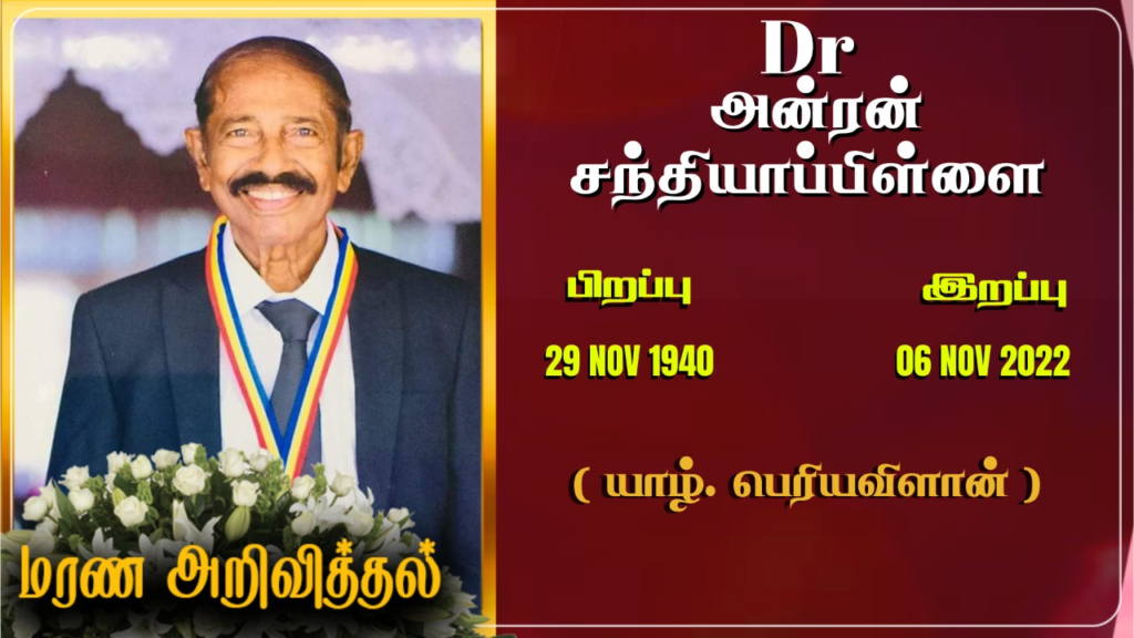 யாழ். பெரியவிளானைப் பூர்வீகமாகவும், சுண்டுக்குழியைப் பிறப்பிடமாகவும், வசிப்பிடமாகவும் கொண்ட அன்ரன் சந்தியாப்பிள்ளை அவர்கள் 06-11-2022 ஞாயிற்றுக்கிழமை அன்று இறைவனடி சேர்ந்தார்.