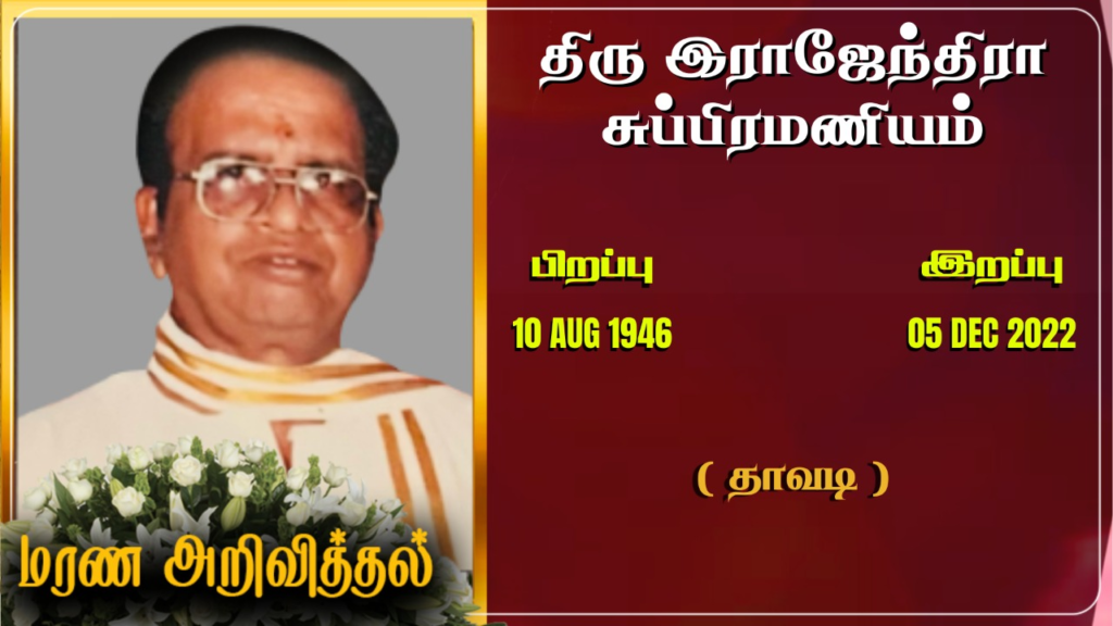 யாழ். தாவடியை பிறப்பிடமாகவும், இணுவிலை வசிப்பிடமாகவும் கொண்ட இராஜேந்திரா சுப்பிரமணியம் அவர்கள் 05-12-2022 திங்கட்கிழமை அன்று இறைவனடி சேர்ந்தார்.