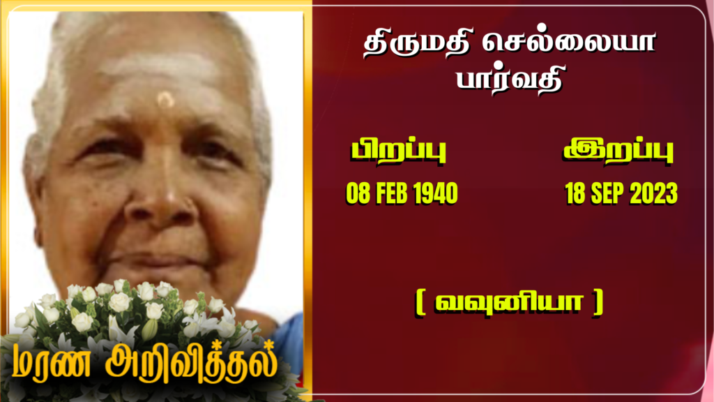 வவுனியா கரம்பைமடு செட்டிக்குளத்தைப் பிறப்பிடமாகவும், வீமன்கல்லு, பன்றிக்கெய்த குளம் ஆகிய இடங்களை வசிப்பிடமாகவும், பண்டாரிகுளத்தை தற்போதைய வசிப்பிடமாகவும் கொண்ட செல்லையா பார்வதி அவர்கள் 18-09-2023 திங்கட்கிழமை அன்று காலமானார்.